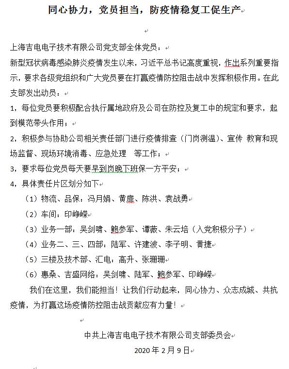 關(guān)鍵時(shí)期,上海吉電堅(jiān)決扛起重任,用實(shí)際行動(dòng)支持政府的疫情防控工作。在2020年開年,為了大家穩(wěn)定的生產(chǎn),幸福的生活,我們一定能夠和全國人民一道戰(zhàn)勝疫情,促進(jìn)經(jīng)濟(jì)的發(fā)展,以貢獻(xiàn)民企的力量,大步朝著新年既定的發(fā)展目標(biāo)繼續(xù)邁進(jìn)。