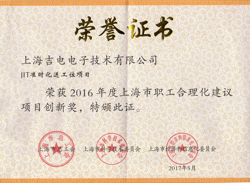 近期,上海吉電電子憑借《JIT準(zhǔn)時化送工位項目》在2016年度上海市職工合理化建議評選活動中榮獲項目創(chuàng)新獎,該獎項由上海市總工會、上海市科學(xué)技術(shù)委員會、上海市經(jīng)濟和信息化委員會聯(lián)合頒發(fā)。